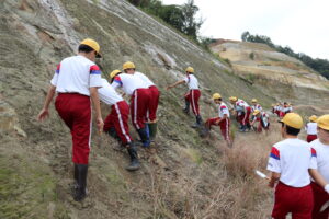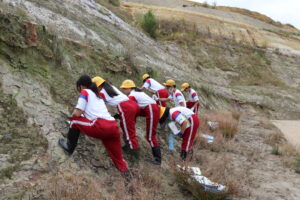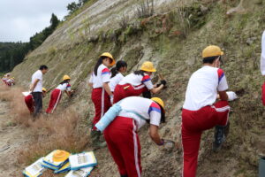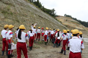 【6年生】地層見学 2025年10月8日 6年生, 学年の部屋 理科「大地のつくり」の学習で露頭(地層が地表に露出しているところ)の見学に行きました。「しま模様に見えるね」「化石見つかるかな」とシャベルで崖の層を掘っていました。採取した土はこの後、詳しく調べていく予定です。