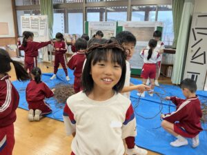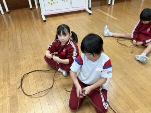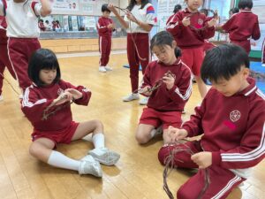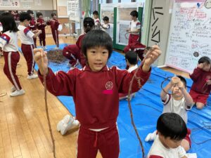 【2年生】さつまいものつるで輪を作ったよ(生活科) 2025年10月31日 2年生 2年生は生活科の学習でサツマイモを育てました。そのサツマイモのつるを使って輪を作りました。「ぼくはクリスマスリースにしたいな」「私はお正月の飾りにしたいな」など、子供たちは想像を膨らませながら楽しく活動をしました。これから、輪に飾りを付けていく予定です。どんな作品が出来上がるのか楽しみです。
