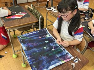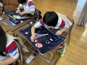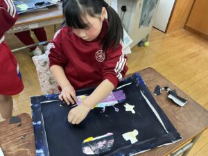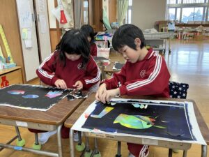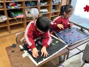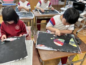 【2年生】ステンシル版画をしました(図工) 2026年1月27日 2年生 2年生は図画工作科の学習でステンシル版画をしています。これまでに、インクとシールを何層にも重ねて版を作ってきました。今日は、シールをめくって作品を完成させました。シールをめくると、先に塗ったインクの色が現れ、カラフルな作品が生まれました。