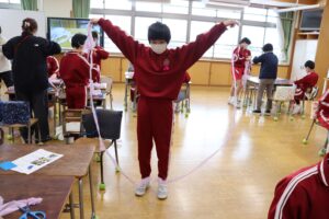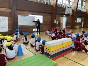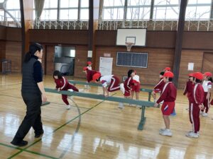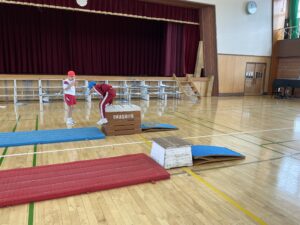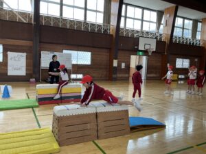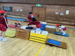 【2年生】跳び箱遊びをしています(体育) 2026年2月16日 2年生 2年生は体育の学習で跳び箱遊びをしています。学習の最初にはカエルやウサギ、クマになりきって動くことで跳び箱を跳ぶための感覚作りをしています。また、4種類のコースを楽しみながら跳んでいます。手を着く位置や踏切の仕方など子供たち同士でコツを教え合いながら取り組んでいます。