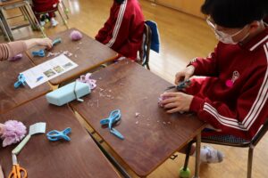 【6年生】コサージュ作り 2026年2月16日 学年の部屋 先週にワイン染めをした生地を使ってコサージュを作りました。織館の松井さんに教えていただき、それぞれの個性あふれるコサージュが出来上がりました。卒業式の準備が少しずつ進み、子供たちの気持ちも卒業に向けて引き締まってきました。