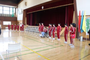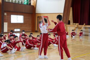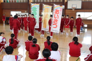 6年生今までありがとう集会~6年生に感謝とエールを届けよう~ 2026年3月6日 1年生, 2年生, 3年生, 4年生, 5年生, 6年生, お知らせ・トピックス, 学年の部屋 「6年生今までありがとう集会~6年生に感謝とエールを届けよう~」を行い、各学年が出し物を披露しました。1年生は、6年生と一緒に8の字跳びをしました。2年生は、劇をしました。 3年生は、リコーダーの演奏や歌を発表しました。4年生は、6年生とじゃんとこいを踊りました。 5年生は、6年間の思い出を劇で表現しました。最後に1~5年生で、歌を歌いました。 6年生は、全校で楽しめるゲームをしました。そして、各教室で使えるチョーク入れやお便りボックスをプレゼントしました。