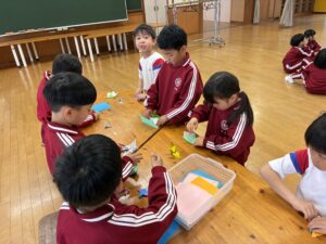 【1年生】学校生活スタート! 2026年4月13日 1年生, お知らせ・トピックス, 学年の部屋 1年生は、学校の過ごし方やきまりについて学習しています。朝の準備や給食は、お手伝いに来てくれる6年生の力も借りながら、少しずつ自分でもできるようになってきました。今日は、初めて制服から運動服に着替えました。休み時間には、粘土遊びやハンカチ落とし、折り紙、読書など思い思いに過ごしていました。