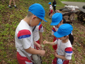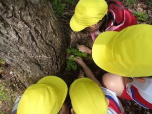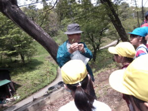【3年生】卵を見つけたよ!(済美) 2026年4月28日 3年生 桜ヶ池にギフチョウの卵を探しに出かけました。ギフチョウの里づくりの会の水上さんから探し方や採取方法を聞いた後、班ごとに探しました。「見つけた!」「小さいね~」自分たちで卵を発見し、これから育てていく気持ちが高まっています。
