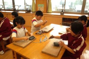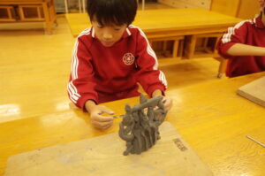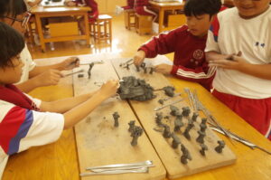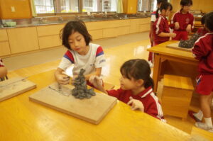 土ねんどの感触を楽しみながら、ねんどべら等を使ってねん土をけずったり、つけたりしました。