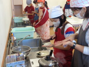 子どもたちはだしの香りを感じたり、お米が炊きあがる様子を観察しながら火加減を調節したりして丁寧に調理をしていました。