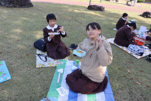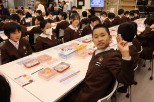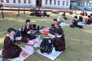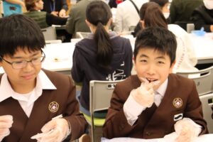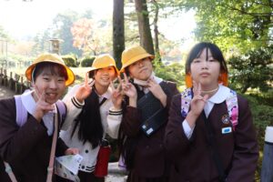 6年生は金沢へ校外学習に出かけました。兼六園を散策したり、歴史博物館を見学したりしました。秋晴れの清々しい青空の下で食べるお弁当はとても美味しかったようです。午後からは観光物産館で和菓子作り体験を行いました。「えっ私、才能あるんじゃない?」「丸くならん!どうして?」と、それぞれ個性豊かな和菓子が出来上がりました。