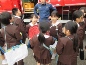 「火の中に入っていく時はどんな気持ちですか。」「人を助けた時はどんな気持ちですか。」と、消防士の仕事にも興味をもってたくさん質問しました。