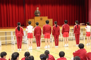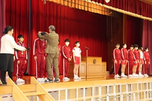 第一交易の西能氏から、スポーツテストや水泳、1000m走等の記録が優れている6年生17名に対して、メダルを授与していただきました。