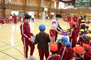 6年生は、全校で楽しめるゲームをしました。そして、各教室で使えるチョーク入れやお便りボックスをプレゼントしました。
