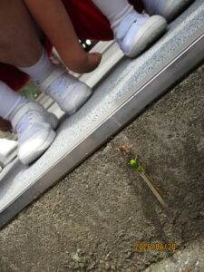 4月28日(火)の休み時間、「とんぼになりそうだよ!」と子供が教えてくれました。行ってみると、ヤゴから透明なトンボが半分ほど体を出していました。